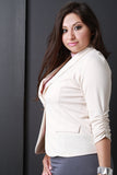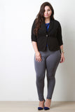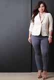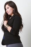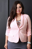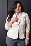 This plus size blazer features a stretchy textured knit fabrication, long sleeve design with ruched detail, shawl collar design, form-flattering seams, and a single button closure. Finished with non functional front pockets. Accessories sold separately. 96% Polyester, 4% Spandex.