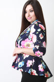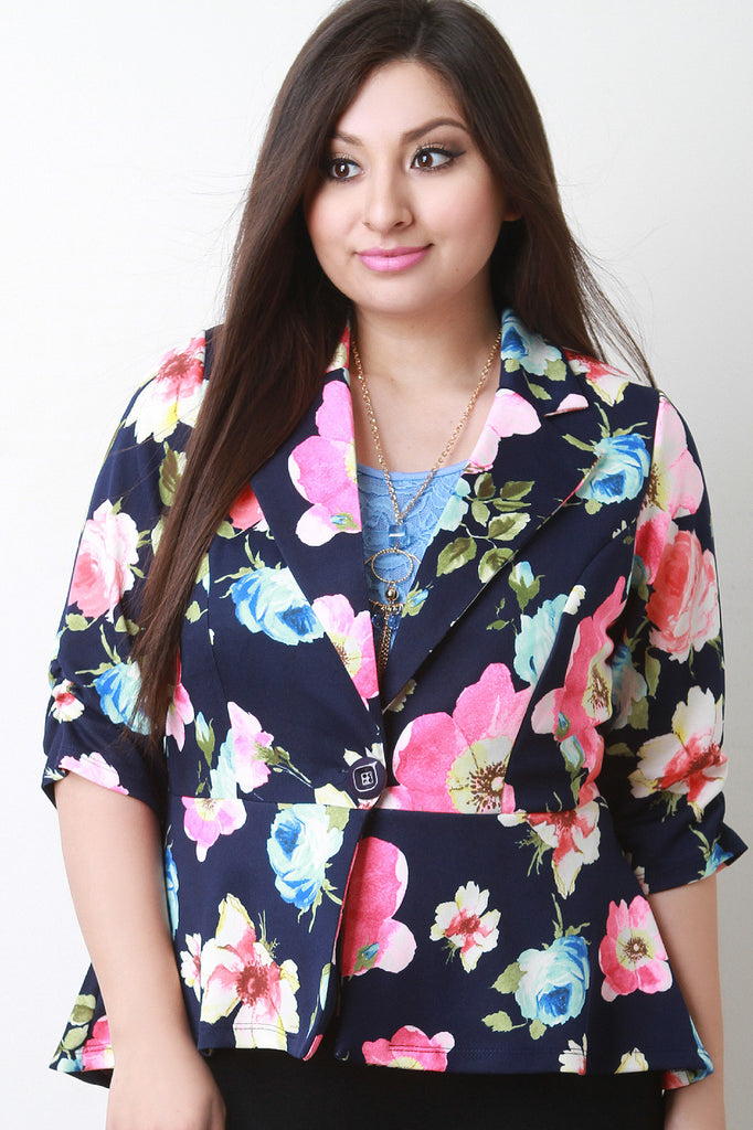 This plus size blazer features a floral print, notch collar, princess seams, peplum, ruched sleeves details, finished with knit fabrication. Accessories sold separately. Made in U.S.A.