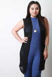 This cardigan features a knit crochet fabrication, open front design, sleeveless fit, and knee-length hemline. Accessories sold separately. 100% Polyester.