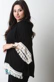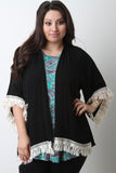 This plus size cardigan features a textured knit fabrication, draped open front construction, and bell sleeves with tassel crochet trims. Finished with an asymmetrical tassel crochet hem. Accessories sold separately. 100% Rayon.
