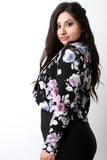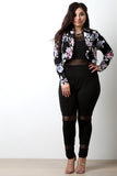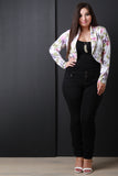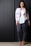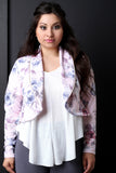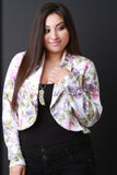 This plus size jacket is blazer silhouette with an open front that features a zipper trim, zipper is non-functional. Crepe knit design. Floral print throughout. Accessories sold separately. Made in U.S.A. 95% Polyester, 5% Spandex.
