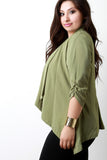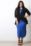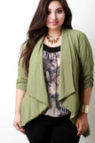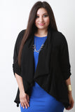 This plus size blazer features a textured knit fabrication, handkerchief hemline, cinched three quarter sleeves, open front, and back pleating detail. Accessories sold separately. 100% Polyester.