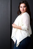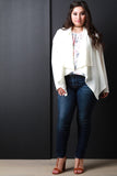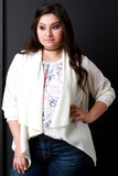 This plus size blazer features a lightweight chiffon knit fabrication, draped open front construction, long sleeves, and asymmetrical hem. Partially lined. Accessories sold separately. 100% Polyester.
