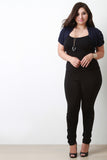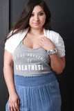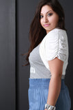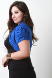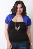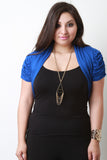 This plus size cardigan features an open front with shawl collar design, ruched short sleeves, and crop hem. Accessories sold separately. Made in U.S.A. 97% Rayon, 3% Spandex.