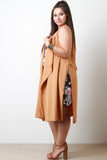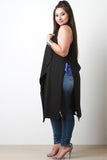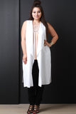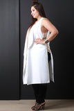 This plus size vest features a longline design, open front with rounded flap collar, side slit opening with connecting sash, and fully lined. Accessories sold separately. 100% Polyester.