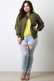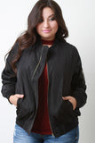 This plus size classic bomber jacket features a zip up front to a ribbed knit collar, long sleeves with zipper pocket, side slit pockets, and ribbed knit hem. Accessories sold separately. 100% Polyester.