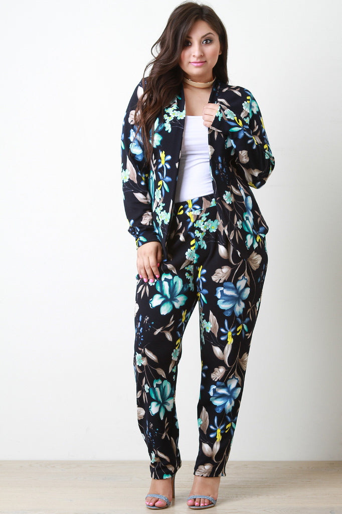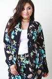 This plus size blazer features a stretchy textured knit fabrication, floral print throughout, open front construction, long sleeves, and asymmetrical hem. Accessories sold separately. Made in U.S.A. 96% Polyester, 4% Spandex.