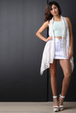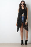 This sleeveless cardigan features a crochet lace fabrication, open front design, and long asymmetrical hemline. Accessories sold separately. 100% Acrylic.