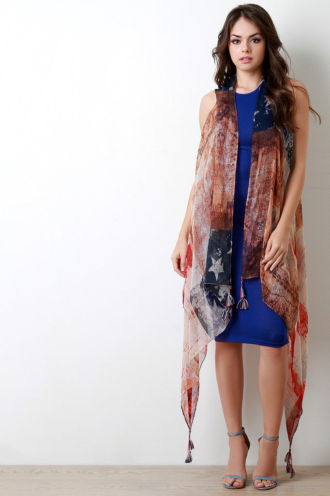 This poncho features a lightweight woven fabrication, faded Stars and Stripes print, open front, and asymmetrical hemline with tassel ends. Accessories sold separately.