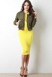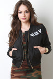 This lightweight bomber jacket features a zipper front, ribbed knit collar, zipper front, long sleeves, slit side pockets, patches d�cor, and fully lined. Accessories sold separately. 65% Cotton, 35% Polyester.