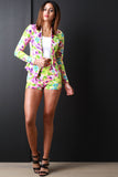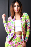 This blazer features a textured knit fabrication with pastel floral print pattern, open front, thin collar, and long sleeves construction. Accessories sold separately. Made in U.S.A. 96% Polyester, 4% Spandex.