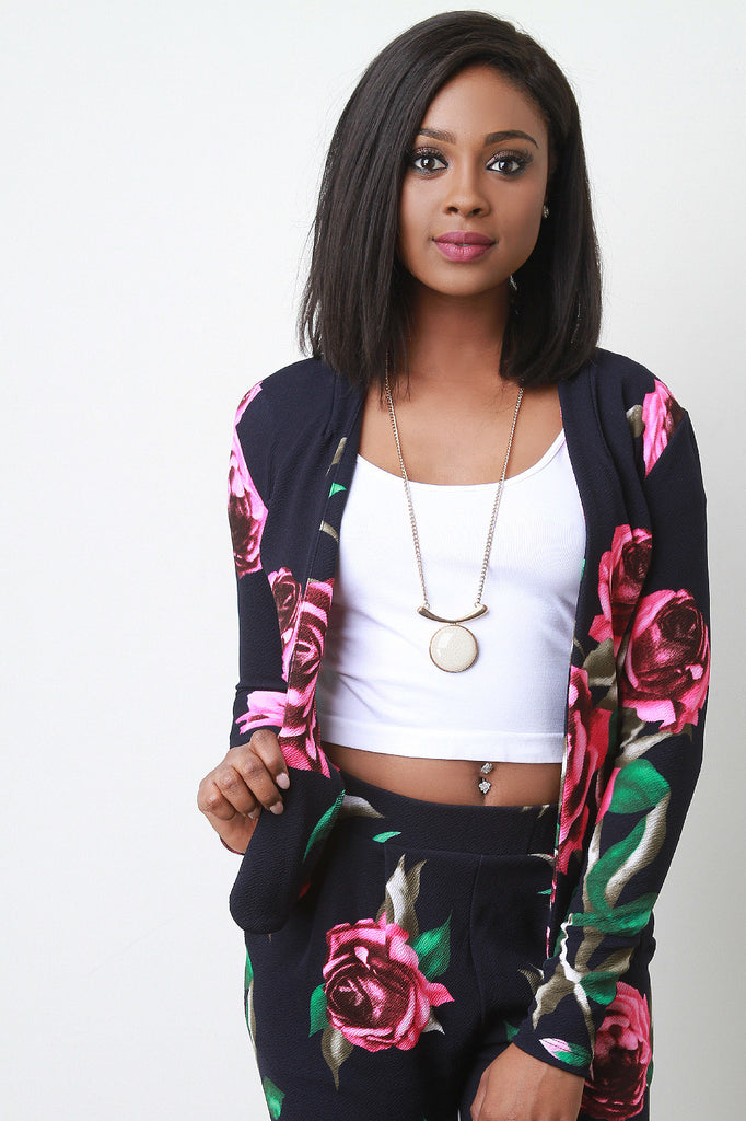This rosette print throughout, open front construction, and long sleeves design. Accessories sold separately. Made in U.S.A. 96% Polyester, 4% Spandex.