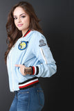 This jacket features a chambray fabrication, zip up front, long sleeves, zipper/pen pocket on left sleeve, side pockets, striped ribbed knit trim, and fully lined. Accessories sold separately. Made in U.S.A. 100% Cotton. Lining: 100% Polyester.