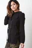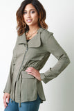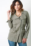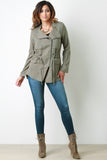This utility inspired jacket features a asymmetrical front zipper closure, flap collar design, front faux pockets, drawstring waist, long sleeves with button closure, and side slit detail. Accessories sold separately. 100% Rayon.