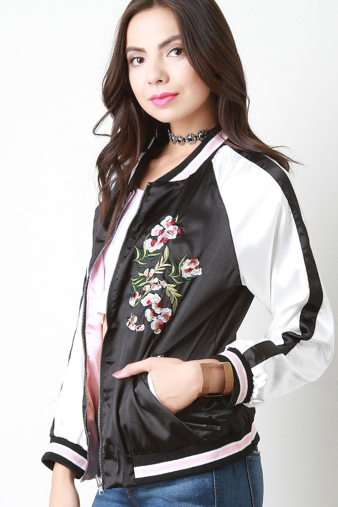 This bomber jacket features glossy charmeuse fabric, embroidered floral accents, zip-up front, two pockets, and reversible design. Accessories sold separately. 100% Polyester.