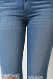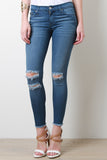 These low rise jeans features belt loops, 5-pockets, zipper fly, single button closure, stretchy taper cut legs, distress holes at knees, and fringe hemline. Accessories sold separately. Made in U.S.A. 59% Rayon, 23% Cotton, 17% Polyester, 1% Spandex.