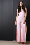This jumpsuit features wide cut legs with slit constructed front, high waist seam, v neckline to spaghetti straps, and open back with cross straps. Accessories sold separately. Made in U.S.A. 95% Rayon, 5% Spandex.