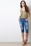 These capri denim jeans features distress front, classic 5-pockets, belt loops, zipper fly, and a single button closure. Accessories sold separately. 80% Cotton, 15% Polyester, 5% Elastane.