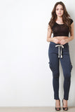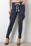These cute cargo pants feature an elastic waistband, self tie drawstring. stretch denim fabrication, classic 5-pocket design with two cargo pockets, and a tapered leg. Accessories sold separately. 95% Cotton, 5% Spandex.