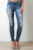 These trendy jeans feature a mid rise skinny fit, stretch denim fabrication, worn in distressed details with a dark denim peeking through, classic 5 pocket design belt loops, single button and zipper closure, and undone hems. Accessories sold separately. 59% Rayon, 23% Cotton, 17% Polyester, 1 % Spandex