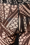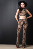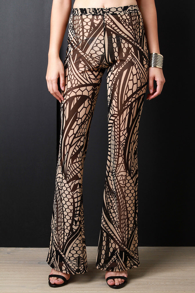These pants feature a semi-sheer mesh fabric, multipattern print design, elasticized high waist fit, and flare cut legs finish. Accessories sold separately. Made in U.S.A. 100% Polyester.