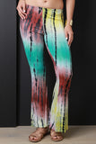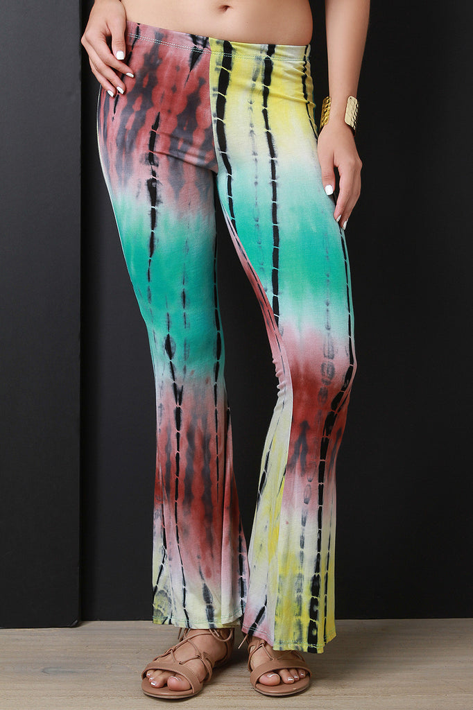 These chic tie dye coloring, elasticized waist, and flare cut legs. Accessories sold separately. Made in U.S.A. 96% Rayon, 4% Spandex.