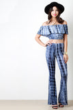 These pants features a jersey knit fabric, blocky tie-dye print design, high waisted, and finished with a flare cut fit. Accessories sold separately. Made in U.S.A. 94% Rayon, 6% Spandex.