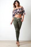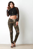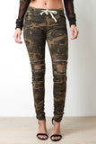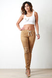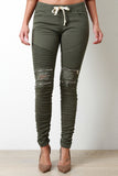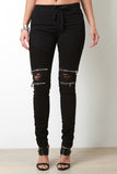 These edgy distressed jeans features an elastic waistband, self tie drawstring, top stitching detail, exposed metal zippers at knee. distressed detail, 4 pocket design, finished with a ruched leg and skinny jean fit. Accessories sold separately. 97% Cotton 3% Spandex.