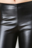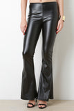 These pants feature a stretch vegan leather fabrication, elastic waist, mid rise fit, with legs that flare from the knee to ankle. Accessories sold separately. Made in U.S.A. 92% Polyester 8% Spandex.