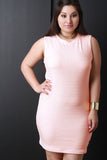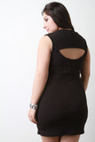 This plus size mini dress features a sleeveless design, cut out back, high round neckline, and stretchy bodycon fit. Accessories sold separately. Made in U.S.A. 96% Polyester, 4% Spandex.