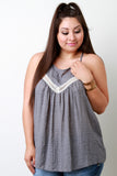 This plus size top features a woven fabrication, crochet inset with ruffle details, scoop neckline, and thin shoulder straps. Accessories sold separately. Made in U.S.A. 100% Cotton.