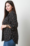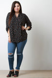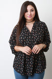 This plus size top features a light weight fabrication, multicolored lipstick print, mandarin v neck collar, gathered detail at yoke, half sleeve button cuff, and a wide rounded hemline. Accessories sold separately. Made in U.S.A. 100% Polyester.