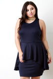 This plus size dress features a soft stretchy knit fabric, round neckline, sleeveless fit, and asymmetrical peplum detail. Finished with a button hook closure at nape. Accessories sold separately. Made in U.S.A. 95% Polyester, 5% Spandex.