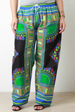 These plus size pants feature colorful African print, elasticized waist, self-tie drawstring, and wide pant legs. Accessories sold separately. 100% Cotton.