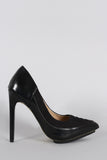 This alluring pointy toe silhouette, contrasting vegan suede trim with stitched detail, low architectural platform, and wrapped stiletto heel. Finished with lightly padded insole and easy slide style.