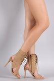 These stylish open toe silhouette, lace up front, cutout design with corset detail at the back, velvet fabrication, low platform, pointed metal aglets, and wrapped stiletto heel. Finished with cushioned insole and side zipper closure for easy on/off.