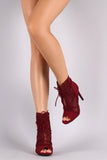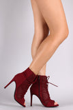 These cute booties feature an open toe silhouette, lattice style cut outs, faux lace up design, wrapped stiletto heel, side zipper for easy on/off and a lightly cushioned insole for comfort.