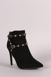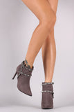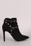 These edgy high heel booties features a pointed toe, vegan suede fabrication, skinny wrapped heel, ankle slit, vegan leather straps with pyramid stud details, and adjustable buckles, faux fur lining and a side zipper for easy on/off.