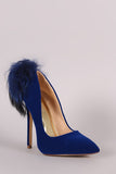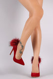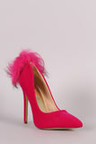 This elegant pump features a plush genuine fur pompom at the back, pointy toe silhouette, and a slim stiletto heel. Finished with a lightly padded insole, vegan leather lining, and easy slide style.