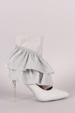 These eye-catching pointy toe silhouette, cutout design with beautiful ruffle detail on the vamp, and lucite stiletto heel. Finished with a lightly padded insole, vegan leather lining, and side zipper closure for easy on/off.