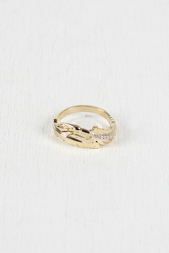 This glossy gold-tone feather quill design with rhinestone accents. Band is not adjustable.