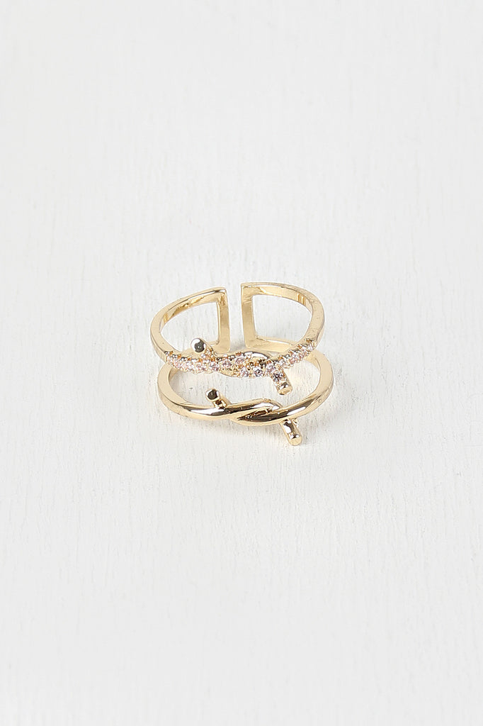 This glossy ring features a double twisted design with sparkling rhinestones accent and cutout open-ended band. Non-adjustable.