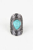 A wide armor ring with a drop-shape faux turquoise stone center and stylized floral designs in glossy enamel.