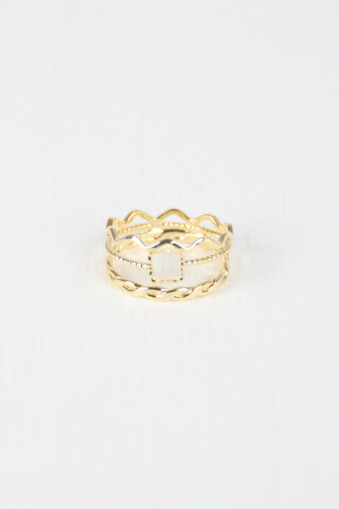This ring features a high polished gold tone finish, faux stacked look, 3 different thin band designs. Non adjustable.