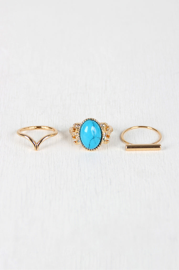 This ring set features three different styles, one turquoise stone ring, one arrow ring, and one bar ring. Finished with a high-polished gold-tone frame.