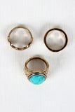 This ring set features three stylish bands. One big faux stone, one deep etched ring, and one with three etched domes detail. Non-adjustable.