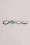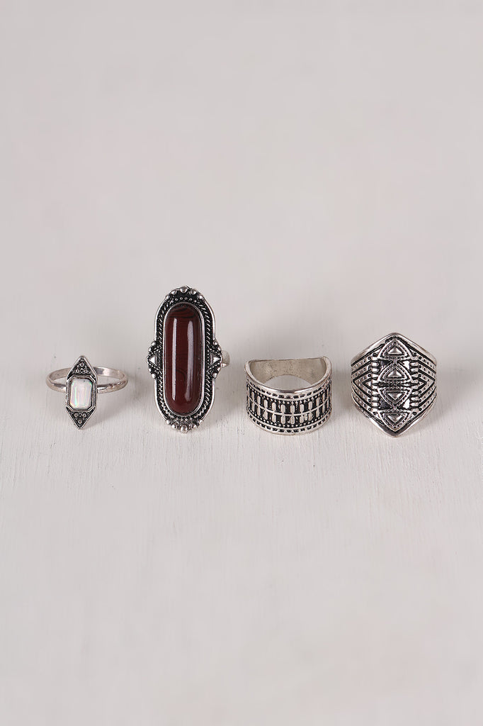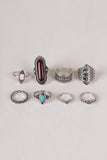 This ring set features 8 etched rings of various designs and sizes, three have stones. Non adjustable bands.