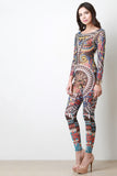This jumpsuit features native tribal pattern print on semi-sheer mesh fabrication, round neckline, long sleeves, and taper cut legs. Accessories sold separately. Made in U.S.A. 95% Polyester, 5% Spandex.