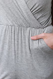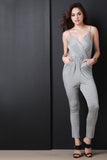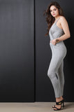This casual jumpsuit features jersey knit fabrication, surplice deep v-neckline, spaghetti straps, cinched elasticized waistband, and open back construction. Finished with two front pockets and taper cut legs. Accessories sold separately. Made in U.S.A. 96% Rayon, 4% Spandex.