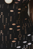 This jumpsuit features a soft knit fabrication, distressed and hole pattern throughout, boat neckline, and sleeveless fit. Finished with taper cut legs. Accessories sold separately. Made in U.S.A. 85% Polyester, 15% Spandex.
